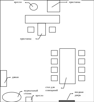 Внутренний объем и форма кабинета. В зависимости от ранга менеджера приемлемая площадь будет от 20 до 50 м2 и высота кабинета минимум 3,5 м. Форма кабинета также имеет большое значение, так как рабочий кабинет менеджера не просто место где он непосредственно работает, но и как правило место проведения планерок, собраний, совещаний. Учитывая это, наиболее рациональной является прямоугольная форма кабинета с соотношением сторон 1:2;