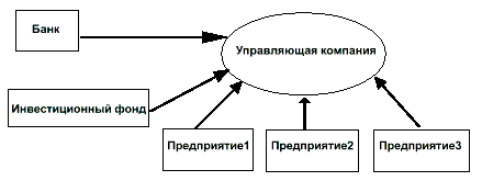 Образование «снизу» происходило, когда промышленные предприятия для привлечения инвестиций и повышения привлекательности совместно с инвестором (часто с группой инвесторов, которые образуют синдикат) создавали управляющую компанию (Рис.7). Доли акций определялись исходя из оценки стоимостей предприятий и долей инвесторов.