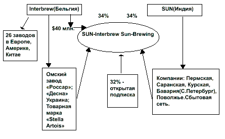При объединении крупнейших бельгийского и индийского пивных концернов была реализована следующая схема. Учредив на паритетных началах управляющую компанию SUN-Interbrew (на базе Sun-Brewing) каждый получил по 34% акций. В качестве вклада в уставной капитал бельгийцы передали акции заводов Россар, Десна, товарную марку пива «Stella Artois» плюс 40 млн. долларов. Индийцы - акции заводов и сбытовую сеть. Кроме того 32% акций новой компании будет продаваться по открытой подписке (Рис.6).