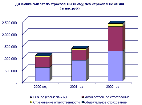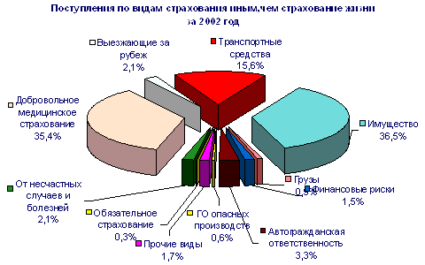 В 2002 г. общий объем страховых взносов составил 10 729 млн. руб. Наибольшая часть страховых взносов, поступившая по договорам страхования, приходится на имущественное и личное страхование. В 2002 г. было собрано страховых взносов по договорам страхования: по страхованию иному, чем страхование жизни: 5 399 млн. руб. (прирост по сравнению с аналогичным периодом 2001 года – 22 %), в том числе личное страхование, кроме страхования жизни: 2 153 млн. руб.; имущественное страхование: 2940 млн. руб., страхованию ответственности: 306 млн. руб.