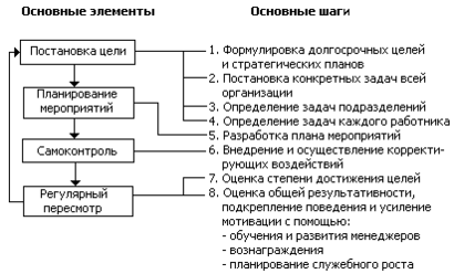 Управление по целям представляет собой основной метод или подход, используемый менеджерами для операционализации процесса постановки целей в организации. Первым важность определения взаимных целей для руководителя и подчиненного, по-видимому, отметил П. Дракер. Он считал, что задача руководства заключается в том, чтобы уравновесить разнообразные потребности и цели.