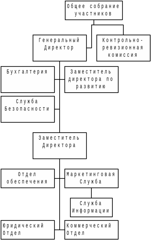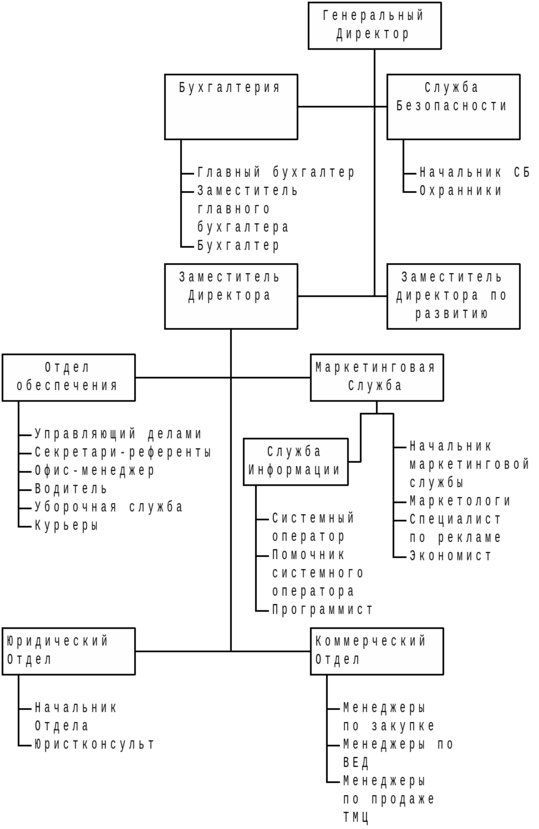 Штатное расписание приведено в соответствие с украинским законодательством. Структура персонала представлена схематично на рисунке 3. Как видно из содержания рисунка, штат сотрудников фирмы достаточно велик. Он представлен Генеральным Директором – главным ответственным лицом на предприятии, координирующим всю деятельность компании, заместителем директора по развитию, бухгалтерами, службой безопасности, коммерческим отделом, маркетинговой службой, юридической службой, службой информации и отделом обеспечения.
