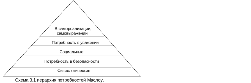 Маслоу утверждал, что поведение человека зависит от того, какой из пяти основных видов потребностей является на данный момент доминирующим. Каждый человек в одно и то же время имеет потребности всех пяти типов, но сила каждой потребности в какое-то конкретное время зависит от личностных приоритетов человека. В зависимости от этих приоритетов выстраивается иерархия потребностей. Маслоу утверждал, что основные пять типов потребностей почти всегда идут в порядке, показанном на схеме 3.1
