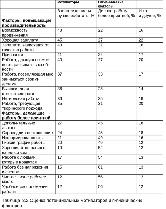 Как показано в табл. 3.2 результаты проведённого исследования на основе опроса служащих можно использовать в качестве подтверждения выводов Герцберга о различии между мотиваторами и гигиеническими факторами.