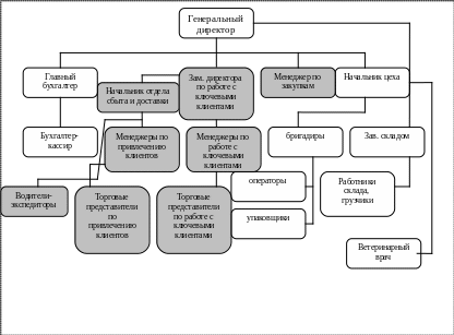 Итак, новую организационную структуру можно увидеть на рис. 2. Серым цветом выделены члены, организованные в команду. Начальник отдела сбыта и снабжения будет контролировать процесс доставки товара и работать целенаправленно на привлечение новых клиентов, Заместитель директора по сбыту займётся непосредственно имеющейся клиентской базой. Считаю такой вариант наиболее рациональным, т. к. сотрудники из фирмы не уходят, у многих из них появляется материальная заинтересованность, чем им так не хватало (см. результаты опроса посредством анкеты), а так же налицо карьерный рост.