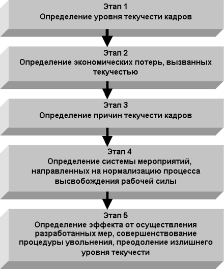 оэтапно приведение уровня текучести к приемлемому значению можно представить в частности через возможность планирования предстоящих увольнений, увязки процессов увольнения с процессами найма, помощи увольняемым работникам (аутплейсмента). Для решения этих и других вопросов, которые будут обозначены после, необходимо исходить из конкретной ситуации на предприятии. Рассматриваемая ниже методика предполагает упорядоченную поэтапную деятельность, осуществление которой следует возложить непосредственно на кадровую службу предприятия. Вся деятельность по управлению текучестью кадров в рамках общего управления персоналом можно представить в виде следующих последовательных стадий:
