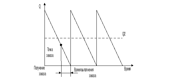 В данной модели можно представить запас как текущий, величина которого колеблется от максимальной в момент поставки ресурсов до минимальной, равного нулю, в момент времени перед выполнением заказа. Если считать потребление равномерным, то изменение текущего запаса можно представить прямой линией (рис. 1.8).