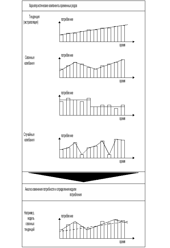 Основой прогнозных методов является подробное выявление всех показателей продажи продукции и использование материалов за прошлый период и их изменения во времени. Обычной формой представления является так называемый временной ряд, анализ которого позволяет сделать заключение об использовании рассматриваемых товаров с учетом таких факторов, как тенденции, сезонные изменения, нестабильность или случайные отклонения. Анализ временного ряда позволяет определить подходящую модель из числа охарактеризованных на рисунке 1.5. Возможными моделями реализации товаров являются: