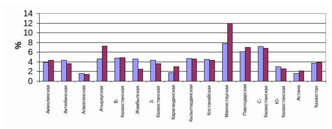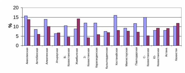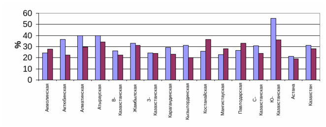 | Акмолинская | 24,2 | 27,6 | Кызылординская | 31,1 | 20,2 |