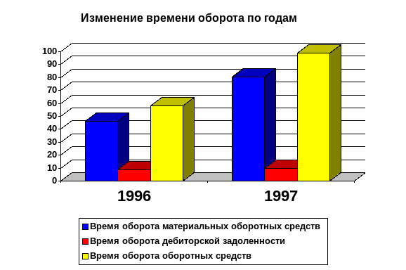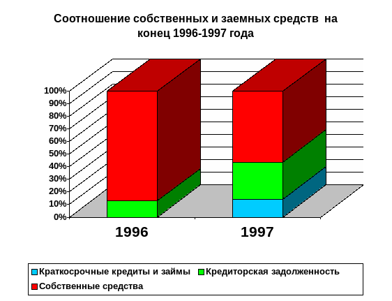Доля наиболее мобильных денежных средств и краткосрочных финансовых вложений возросла на 2,6% (выросли на 161 612 тыс. рублей) в структуре оборотных средств. Но несмотря рост в 8 раз, доля их в структуре оборотных средств составила лишь 5,6% на конец отчетного года, при 3% на конец 1996 года.