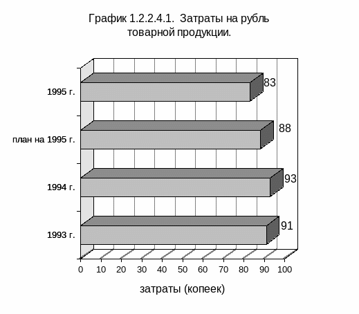В 1996 г. было получено снижение затрат на рубль товарной продукции по сравнению с планом на 5,7 %, по сравнению с 1995 г. на 10,8 %. Это явилось следствием опережения роста товарного выпуска в оптовых ценах над его себестоимостью по сравнению как с планом, так и с 1995 г.