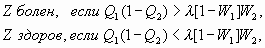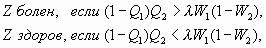 где λ = P(V2)/P(V1) – отношение априорных вероятностей здоровых и больных пациентов.