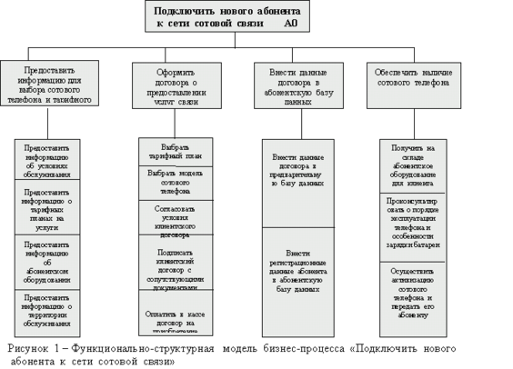 На рисунке 1 представлена, в качестве примера, функционально-структурная модель бизнес-процесса “Подключить нового абонента к сети сотовой связи, а на рисунке 2 - декомпозиция главной (исходной) функции блока А0 данного бизнес-процесса.