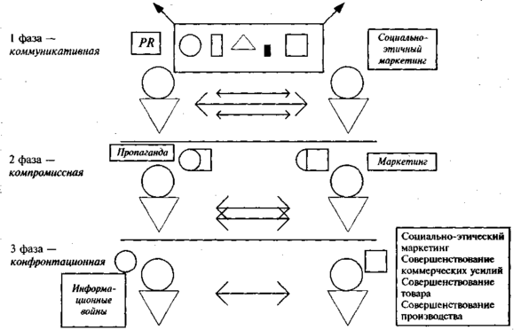 К сожалению, ни PR, ни социально-этичный маркетинг (как и общественное согласие) не могут возникнуть в более ранних фазах конфликта. Поэтому наш маркетинг, как правило, — «боевой», PR — «черный», а реклама — инструмент манипуляции потребителем.