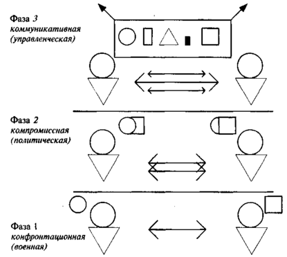 Конфликт начинается с конфронтационной (военной) фазы, а заканчивается коммуникативной (управленческой). Таким образом, конфликт можно определить и как процесс развития взаимодействия субъектов от конфронтации к коммуникации (рис. 3).
