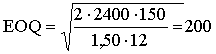 Например, фирма сбывает равномерно в течение года (N = 12 месяцев) в общей сложности D = 2400 штук изделий. Издержки хранения составляют H = 1,50 руб./шт. в единицу времени (за месяц), издержки заказа составляют O = 150 руб./заказ, тогда оптимальный объем пополнения запасов (величина заказа) равен: