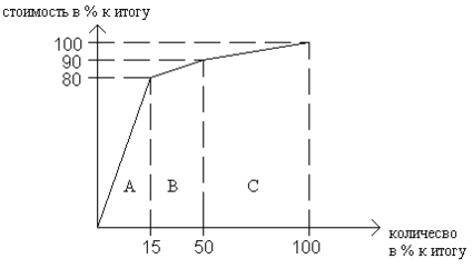 Таким образом, 15 % деталей составляют 80 % стоимости (группа А), 35 % – 15 % (группа В), 50 % -5 % (группа С).