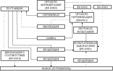 На уровне европейских стран, взаимоотношения субъектов сертификации регулируются серией европейских стандартов EN 45000. Многие органы по сертификации и испытательные лаборатории, осуществляющие испытания в целях сертификации, проходят аккредитацию, т. е. получают официальное признание того, что они могут проводить определенные виды деятельности. В частности, аккредитация может заключаться в том, что орган по аккредитации, руководствуясь стандартами EN 45002 или EN 45010, проверяет выполнение испытательной лабораторией или органом по сертификации стандартов EN 45001 или EN 45011, соответственно.