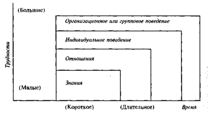 1) Изменение в знаниях — требует минимального времени и минимальных затрат, достаточно провести программу обучения, распространить материалы, например, инструкции. Однако проблема связана с тем, что почти все могут знать, как надо делать, но никто в организации не будет делать так, как надо, потому что может считать это неважным, слишком сложным, неэффективным и т.д.