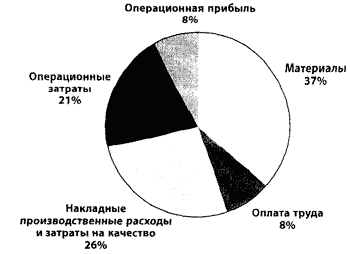 Насколько велика доля накладных производственных расходов и затрат на плохое качество? Круговая диаграмма на рис. 1.3 показывает распределение затрат в процентах от валового дохода для 1000 ведущих американских производственных компаний.