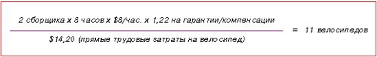 Например, при бенчмаркинге трудовых затрат при сборке велосипедов у конкурента, зная, что каждому рабочему платится, скажем, $8,00 в час, затраты на гарантии и компенсации составляют примерно 22% к базовой оплате, и если два сборщика собирают 11 велосипедов за 8 часов, то можно рассчитать прямые затраты на единицу изделия - $14,20. Если велосипед продается за 100 долларов, тогда прямые трудовые затраты - 14,2% от общего объема продаж: