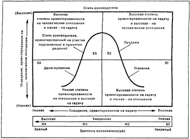 На рисунке выше показаны четыре стиля руководителя. Для подчинённых с низким уровнем зрелости применим такой вид, как “давать указания”, поскольку руководитель исходит из того, что подчинённые либо не хотят, либо не способны отвечать за конкретную задачу и им нужны инструкции, руководство и строгий контроль. От руководителей требуется большая ориентированность на задачу и малоориентированный на человеческие отношения стиль S1.