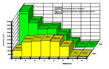 Распределение затраты на материалы и основную заработную плату работников по календарным периодам (кварталам) показаны в виде диаграмм (см.рис.3):