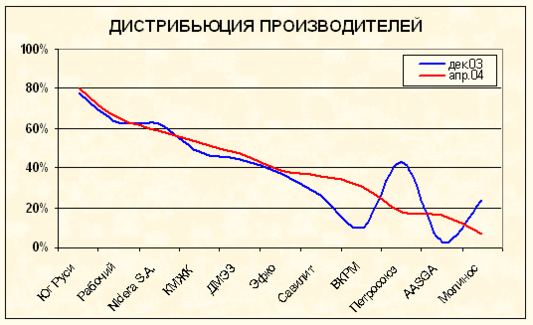 График 3 показывает нам, что лидирующие позиции занимают ростовские производители «Юг Руси» и «Рабочий». Но более всего этот график интересен тем, что помогает понять особенность розницы: при дистрибьюции ниже 40% рыночное положение становится неустойчивым, существует высокая вероятность потери рыночной позиции. Колебания синей линии относительно красной, которые начинаются с отметки 40% очень наглядно демонстрируют это положение.