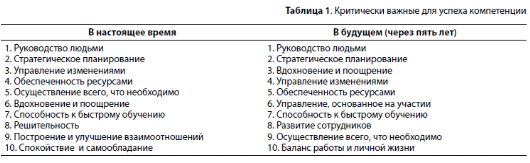 Для более глубокого понимания ситуации с развитием компетенций нам бы хотелось конкретизировать критически важные компетенции для успеха руководителей сегодня и через пять лет, выбрав лишь 10 самых важных из 20 оцененных (табл.1).