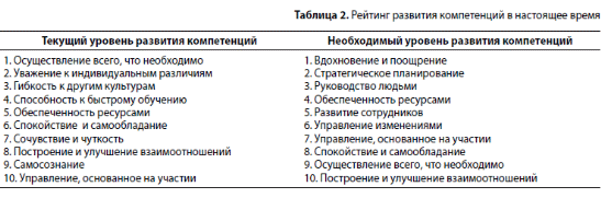В табл.2 приведен рейтинг текущего уровня развития компетенций по мнению респондентов и рейтинг компетенций, необходимый для максимальной эффективности и успеха в современных условиях.