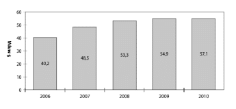 Рис. 1. Динамика роста объема рынка транспортно-логистических услуг в России, 2006–2010 гг.