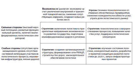 Резюмируя сказанное, обозначим с позиций классического SWOT-анализа сильные и слабые стороны российской логистики, ее возможности и воздействующие на нее негативные факторы (угрозы).