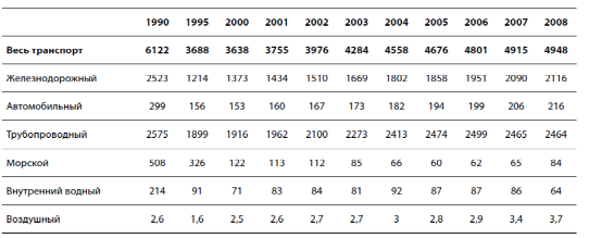 Сравнив данные таблиц за 2008 г., мы увидим, что общий грузооборот транспорта составляет 4948 млрд т/км, а оборот организаций транспорта — 4350,5 млрд руб. (5668,5 – – 1318). Таким образом, стоимость одного тоннокилометра составляет 0,88 руб. (4350,5 / 4948).