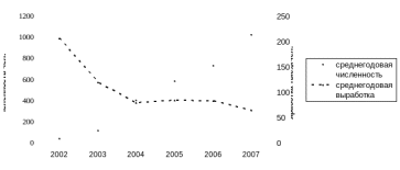По приведенным данным сразу можно выявить ряд тенденций и закономерностей, характерных для всех подразделений фирмы, устойчивый рост среднегодовой численности персонала и снижающуюся при этом производительность труда. Рассмотрим динамику изменения среднегодовой численности работников и средней выработки (табл.3.2).