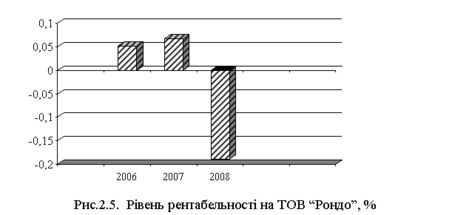 Рівень рентабельності на підприємстві становить в 2006 р. 0,051 %, у 2007 р. 0,067 %, а у 2008 р. даний показник зменшився до –0,189 % (рис. 2.5) Відхилення 2008 р. від 2006 р. становить –0,24047% а від 2007 р. –0,256 %.