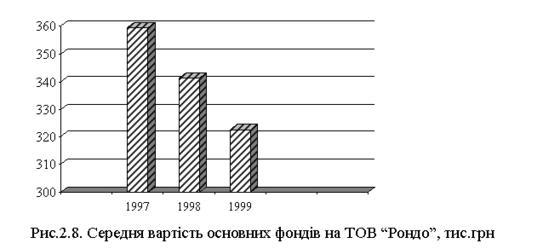 Середня вартість основних фондів на ТОВ “Рондо” була відносно сталою в 3-х аналізуємих періодах (також спостерігається поступове спадання) і становила 359,520 тис.грн. в 2006 р., у 2007 р. 341,230 тис.грн., у 2008 р. 322,500 тис.грн.(рис.2.8). Відхилення також не значне. Порівнюючи 2008 рік з 2006 року то воно становить –37,02 тис.грн., а порівнюючи 2008 рік з 2007 роком, то даний показник становить –18,730 (таблиця 2.1).