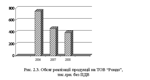 Обсяг реалізації продукції на підприємстві становить в 2006 р. 752,68 тис.грн. у 2007 р. 462 тис.грн., а у 2008 р. даний показник зменшився до 393,58 тис.грн.(рис. 2.3) Відхилення 2008 р. від 2006 р. становить –359,58 а від 2007 р. –68,90 тис.грн.