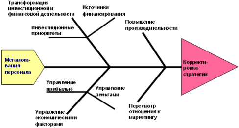 Рекомендаций есть много таких, которые заслуживают внимания и могут быть использованы в реальной практике. Но очень важно понять, что главным условием любой успешной работы является системность, которая в условиях кризиса, становится критически необходимым атрибутом управления бизнесом. Ниже сделана попытка системного представления всех антикризисных мер. Система представлена рис. 1, она имеет форму рыбы, которая носит название диаграммы Иссикавы.