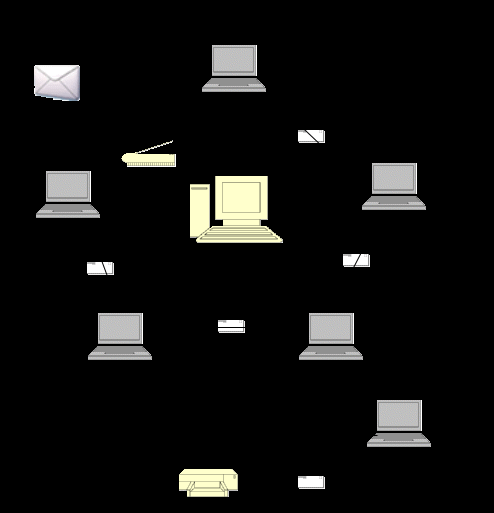 Корпоративные компьютеры – это многопользовательские системы, имеющие центральный блок с большой вычислительной мощностью и значительными информационными ресурсами, к которому подсоединяются большое количество рабочих мест с минимальной оснащённостью: видеотерминал, клавиатура, устройство позиционирования типа "мышь" и, возможно, устройство печати (рис.1).
