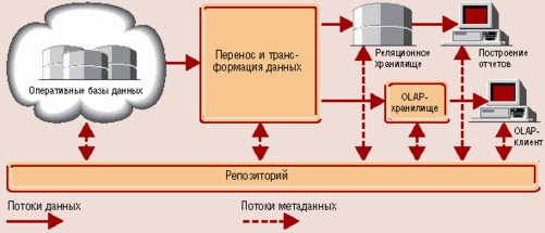 Оперативные данные собираются из различных источников, очищаются, интегрируются и складываются в реляционное хранилище. При этом они уже доступны для анализа при помощи различных средств построения отчетов. Затем данные (полностью или частично) подготавливаются для OLAP-анализа. Они могут быть загружены в специальную БД OLAP или оставлены в реляционном хранилище. Важнейшим его элементом являются метаданные, т. е. информация о структуре, размещении и трансформации данных. Благодаря им обеспечивается эффективное взаимодействие различных компонентов хранилища.