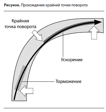 Отчасти разница между ощущением быстрой езды и действительно быстрой ездой заключается в увеличении радиуса траектории на повороте. Прохождение крутых поворотов приводит к снижению скорости, и ваш мотор с усилием снова набирает обороты. Профессиональные автогонщики двигаются от края внешней стороны трассы к внутренней, затем, миновав поворот, снова к внешней стороне, значительно увеличивая радиус поворота и сохраняя максимальную скорость (см. рисунок) [3].