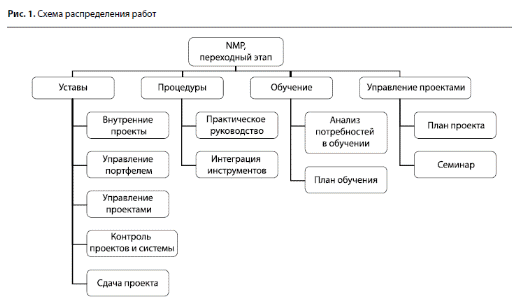Схема распределения работ (рис. 1) идентифицирует ключевые работы и результаты, необходимые для успешного завершения проекта.