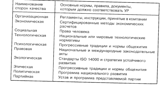 Качество управленческого решения может рассматриваться с организационной,, экономической, социальной, технологической, психологической, правовой, экологической, этической, политической и партийной стороны. Каждая из этих составляющих имеет свои правила, нормы, нормативы или стандарты (рис. 2).
