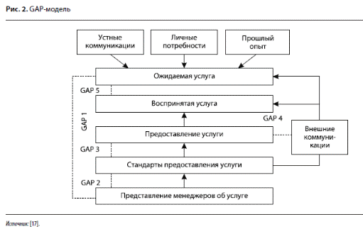 В ней выделяются возможные несоответствия (разрывы) при предоставлении услуги. Их размер и направленность являются определяющими факторами при оценке потребителями качества услуги. Ключевым показателем является разрыв между «ожидаемой» и «воспринятой» услугами (GAP 5), причем под «разрывом» в данном случае понимается превышение оценкой, данной потребителем ожидаемой услуге, оценки реально полученной. Таким образом, услуга является качественной в том случае, если такой разрыв отсутствует, т.е. оценка воспринятой услуги равна оценке ожидаемой услуги или превышает ее. Существование GAP 5 обуславливается остальными разрывами (GAP 1–4) модели [7].