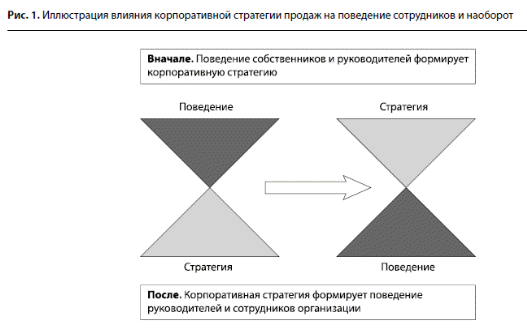 На стадиях создания и первоначального развития компании поведение руководителей определяет выбираемую корпоративную стратегию, а потом уже КСП влияет на торговый персонал (рис. 1).