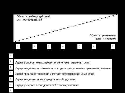 На рисунке 3 континуум представлен в форме диаграммы с дополнением в виде указателя, размещенных вдоль оси и снабженных описаниям, различных методов руководства. Это облегчает менеджеру определение своего положения вдоль оси стиля руководства.