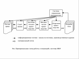 В процессе реализации этих целей система MRP обеспечивает поток плановых количеств материальных ресурсов и запасов продукции на горизонте планирования. Система MRP сначала определяет, сколько и в какие сроки необходимо произвести конечной продукции. Затем система определяет время и необходимые количества материальных ресурсов для выполнения производственного расписания.