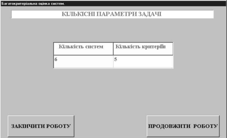 Після появи вікна "Кількісні параметри задачі" (Рис.2) ввести кількість аналізуємих МА та кількість критеріїв і натиснути кнопку "Продовжити роботу".