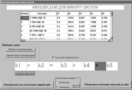 Після появи вікна "Вихідні дані для вибору систем" (Рис.3) ввести дані щодо складу МА та значення прийнятих критеріїв, після чого ввести, в залежності від напрямку покращення критеріїв ідеалізований варіант МА.