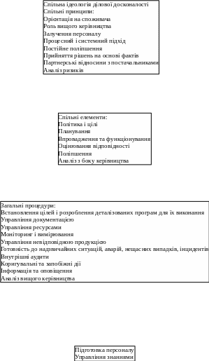 Порівняльний аналіз вимог найбільш розповсюджених на сьогодні стандартів на окремі системи управління 6 - 9 свідчить про їх близькість у застосуванні спільних підходів та елементів. Відповідність вимог на системи управління наведено у таблиці 2.
